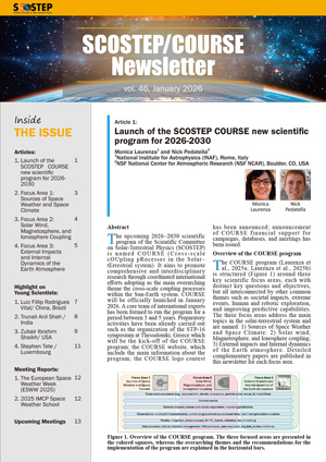 SCOSTEP/COURSE Newsletter vol.46を出版 国際学術会議(ISC)傘下のSCOSTEP(太陽地球系物理学科学委員会)と、SCOSTEPが2026-2030に推進する国際プログラムCOURSE(太陽地球系システムのスケール間結合過程)のニュースレター第46号を編集し、世界各国の研究者に配布しました。