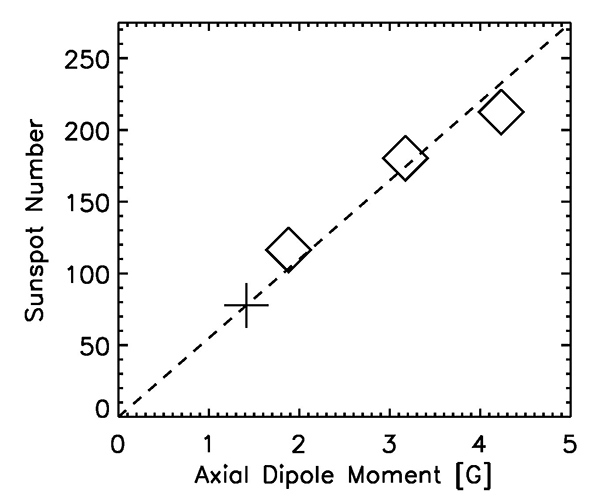 Fig. 2 : Prediction of the maximum sunspot number in the Cycle N compared with the strength of the polar field indicator at the activity minimum in the Cycle N-1.