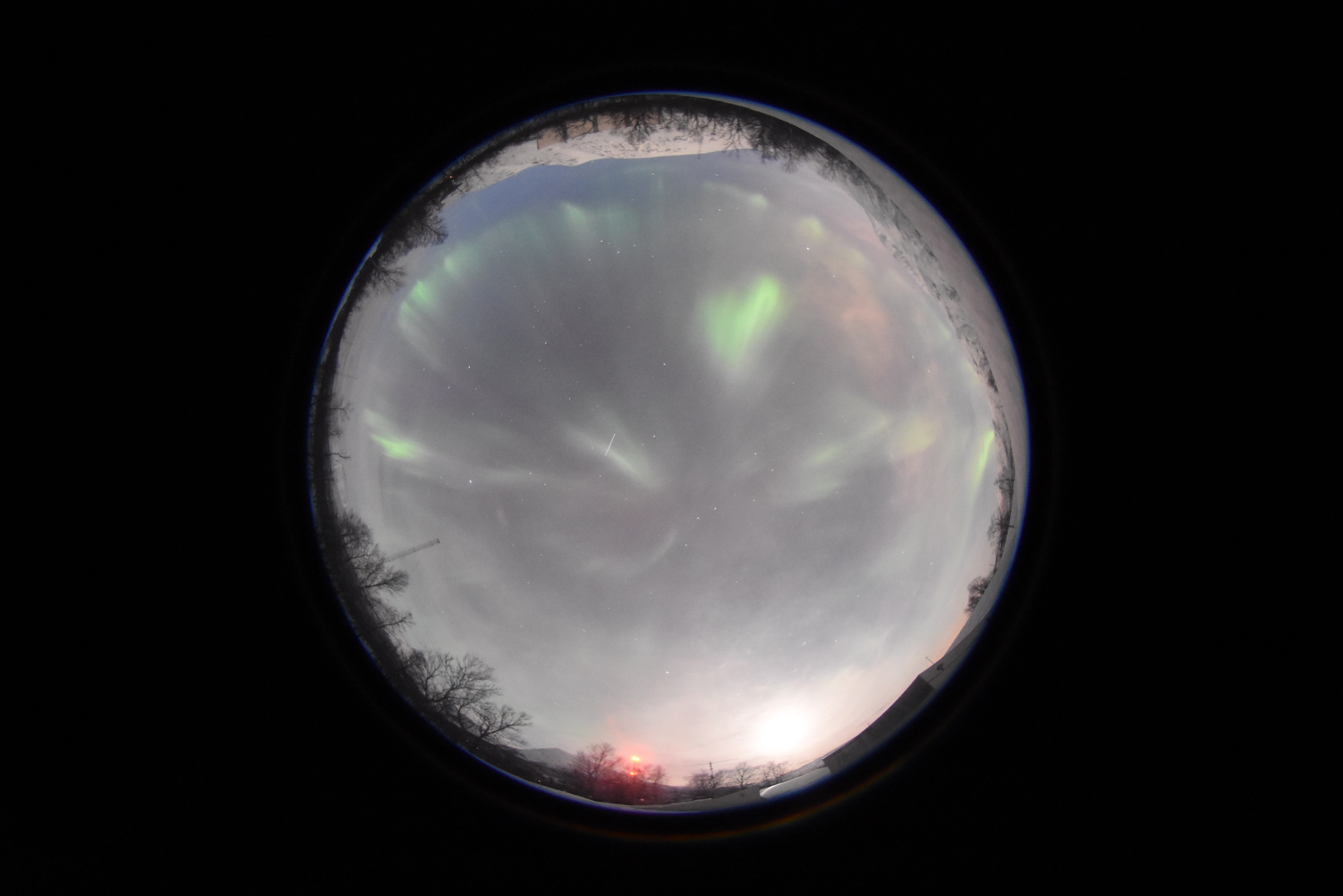 Meteor trail with green aurora rays!