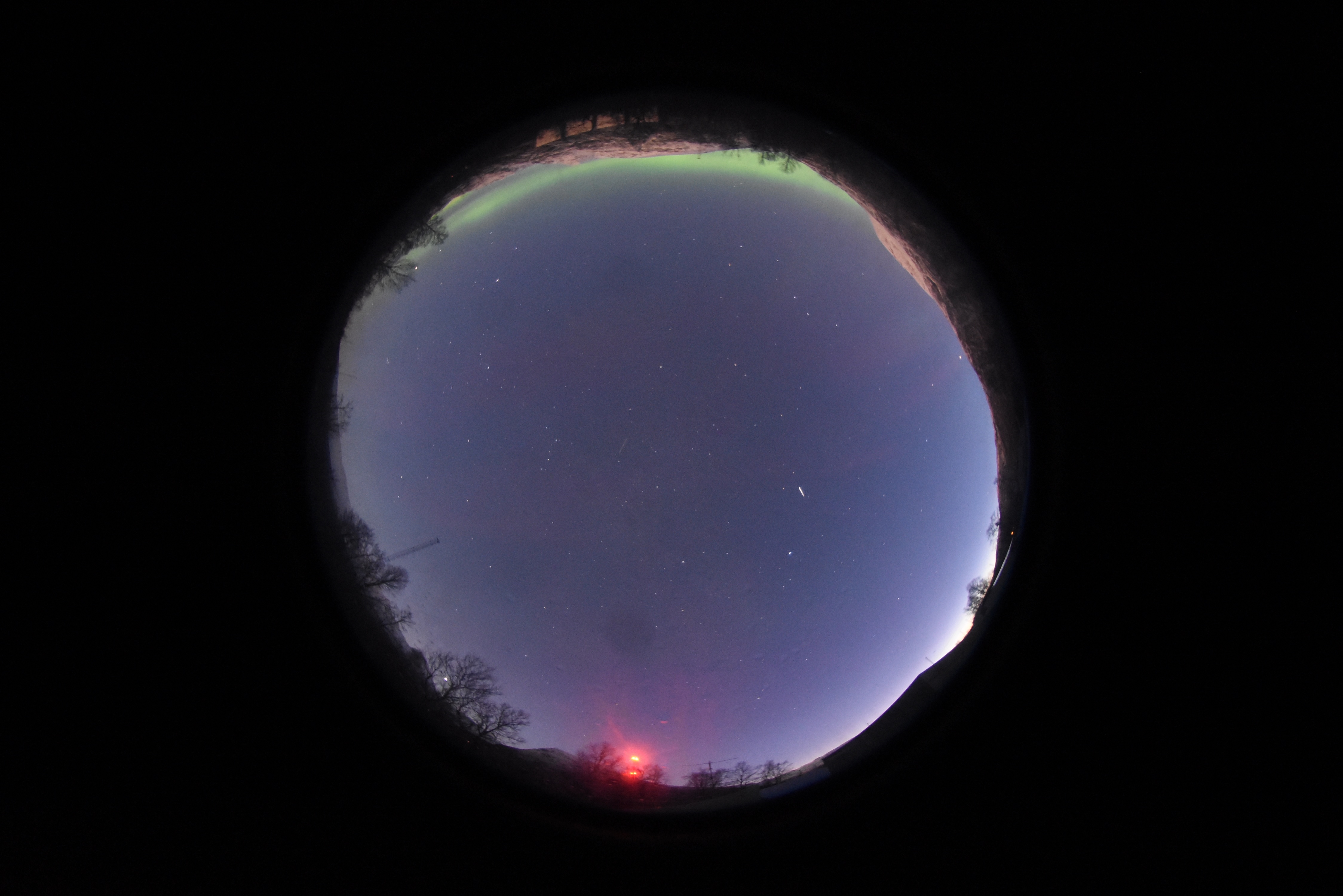 Meteor trail with green aurora arc